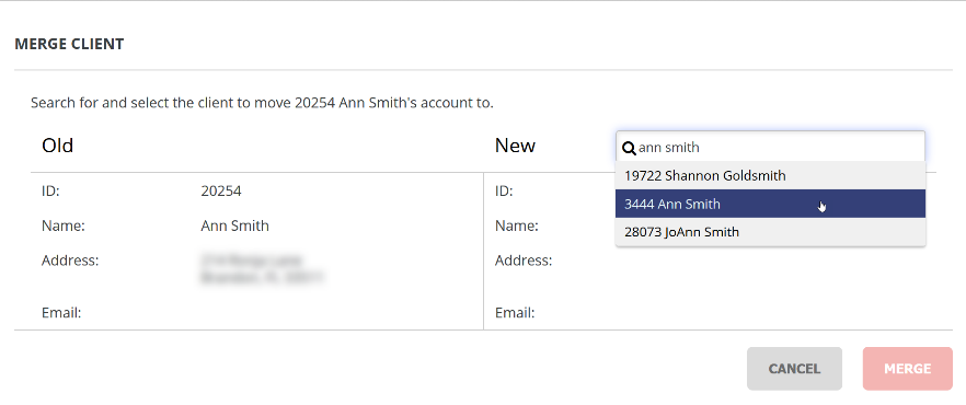 - In the Merge Client New search field, type the name or new ID for the client.
