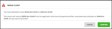 - Upon confirmation, the payment profile(s), patient(s) and plan(s) information is moved to the new account for the client and the previous client account is inactivated